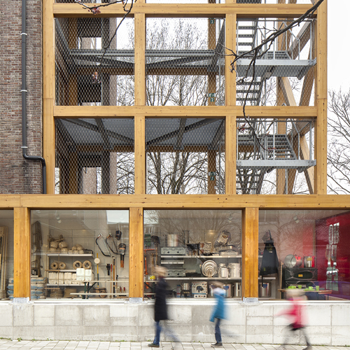 The local restaurant on the ground floor has a view of the new town square and is connected with the foyer inside. This foyer spreads over the different floors of the building and as such functions as a perfect meeting place for the users of this complex.