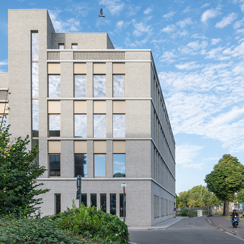 This new extension consists of a basement, a ground floor and a first floor. It has an enfilade of concrete frames with a 3,6 m width. This width allows the set-up of both closed and open office spaces. In the longitudinal direction the frames divide the building into three bays. The working spaces are in the outside bays. The inside bay is designed as an informal meeting place with a small kitchen, print and copy corners. The two open stairways that connect the floors are accessible through this area. Wooden wall panels in maple are placed in between the concrete frames. The acoustic ceilings are covered with maple lamellas. The monochrome black details in the façade are a modest reminiscence of the structure.